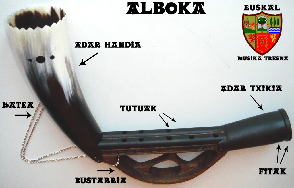 Alboka, also known as albogue (the Spanish word for flute), is a type of small wind instrument that has a single reed and two melody pipes. One of the pipes has three holes, while the other has five holes in it. These tubes were held together by a handle that has two or three finger holes. This handle that holds together the melody pipes were made out of wood. It also has a bell that is made out of an animal horn. This resonating bell is made of a longer section of the animal horn to help amplify the sound emitted by the instrument.